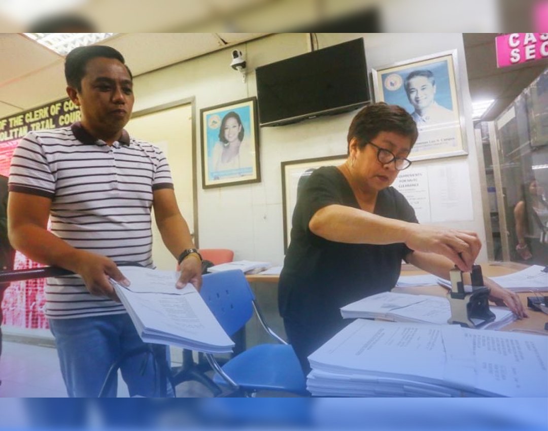 TINANGGAP ni Cynthia Sanchez, Record Officer 1 ng Makati Metropolitan Trial Court mula sa isang kinatawan ng United Nationalist Alliance o UNA ang mga dokumento na naglalayong madiskwalipika ang mahigit 10,000 diumano’y mapanlinlang na mga rehistro na hindi bonafide na residente ng Makati.(Danny Bacolod)