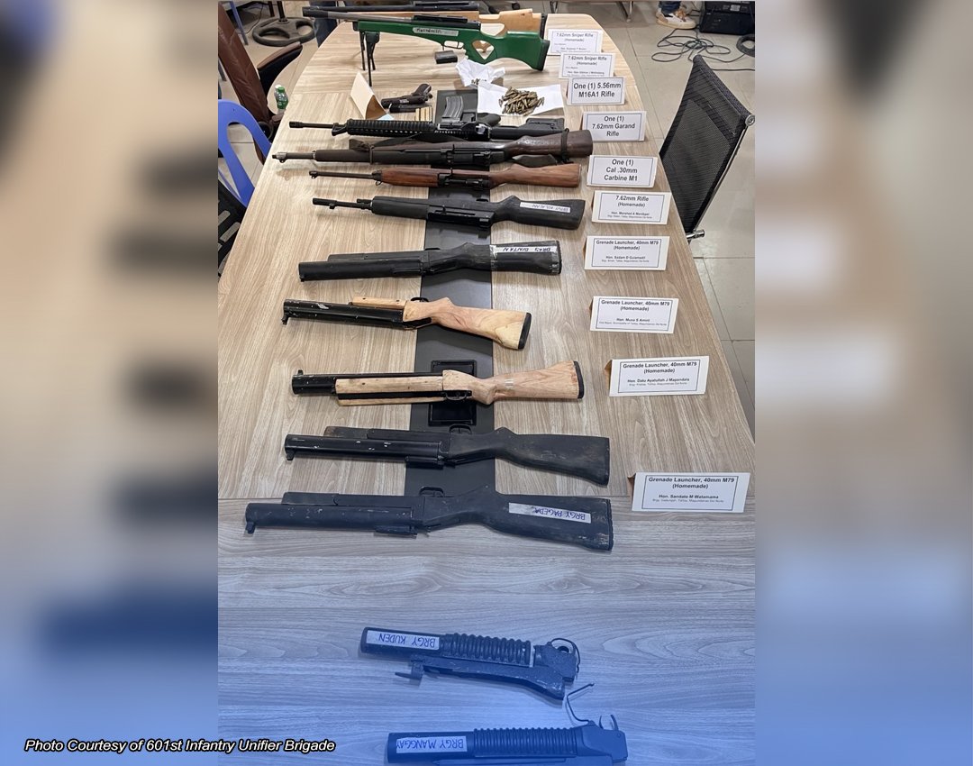 Iprinisinta kay Brig. Gen. Edgar Catu, Brigade Commander ng 601st Infantry Brigade, ang iba’t ibang uri ng armas na nakalap mula sa iba’t ibang barangay mula sa munisipyo ng Talitay, Maguindanao del Norte.