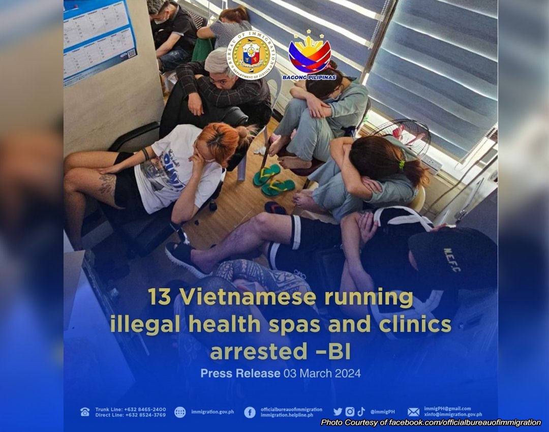 INARESTO ng mga tauhan ng Bureau of Immigration (BI) ang 13 Vietnamese nationals dahil sa pag-o-operate ng illegal health spas at clinic sa Metro Manila.