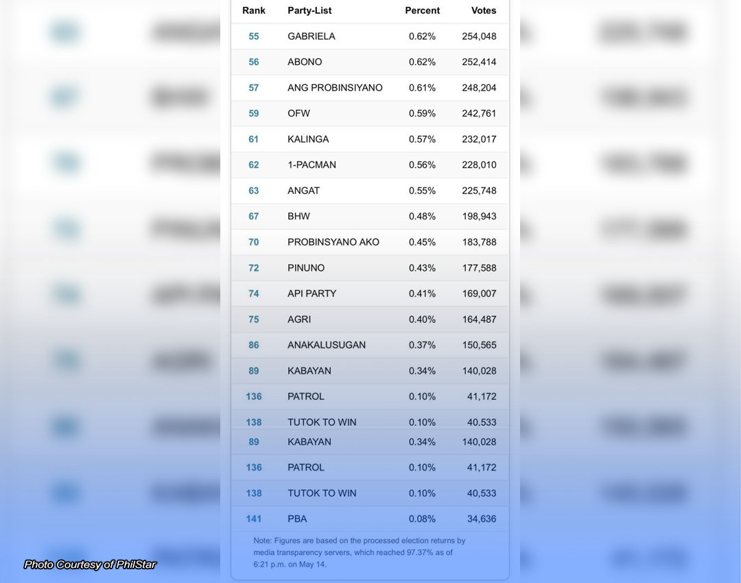 Kabilang sa mga incumbent party-list na hindi sinuwerte ang Anakalusugan, Barangay Health Workers (BHW), Kabayan, Angat, Tutok to Win, Kalinga, 1Pacman, ang Probinsyano, Probinsyano Ako, Abono, Pinuno, Agri, OFW, API at TicTok.