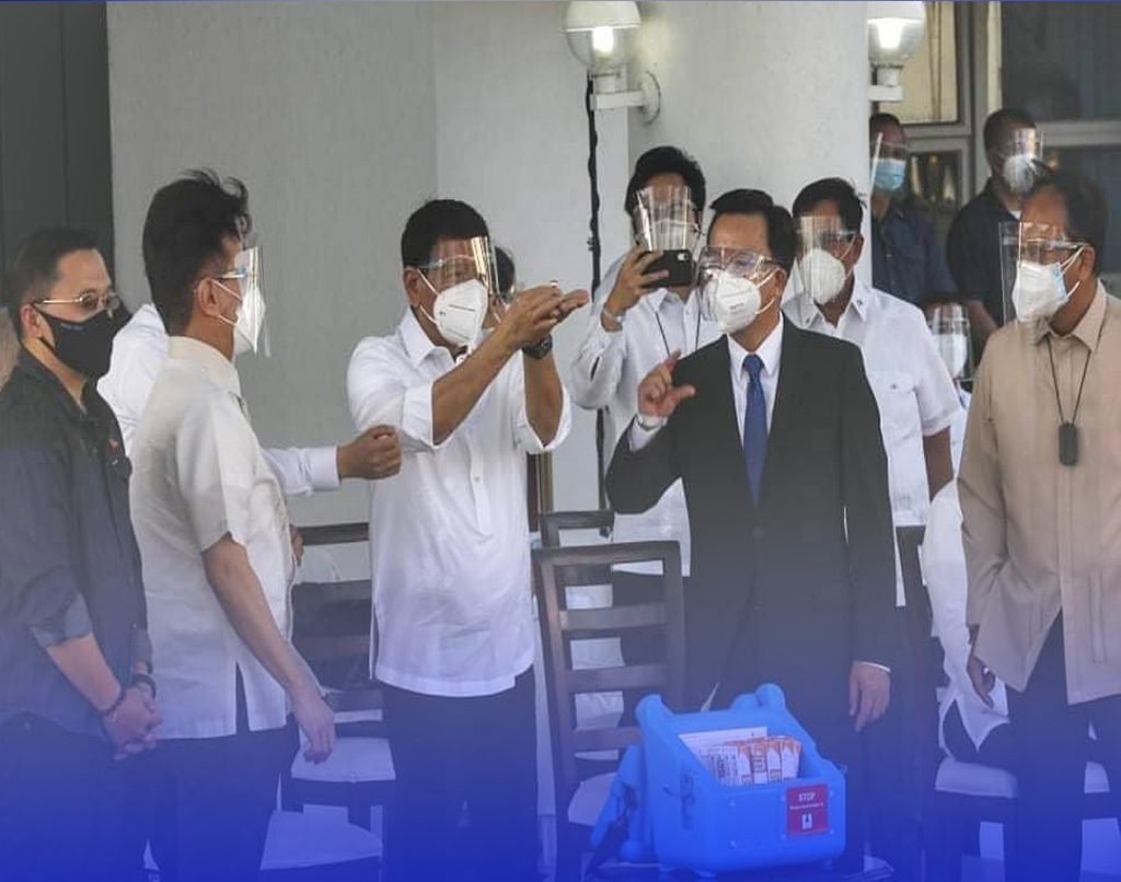 PINANGUNAHAN ni Pangulong Rodrigo Roa Duterte ang pagsalubong at pagtanggap sa COVID-19 vaccine ng Sinovac galing sa bansang China. Kasama ng pangulo si Chinese Ambassador Huang Xilian, ang buong miyembro ng kanyang gabinete at si Senador Bong Go na sumalubong sa nasabing bakuna sa Villamor Air Base sa lungsod ng Pasay. Sa welcome ceremony, makikita na nag-fist bump sina Pangulong Duterte at Ambassador Huang Xilian. Sinaksihan ni Pangulong Duterte ang uploading ng bakunang Sinovac mula sa eroplano at ininspeksyon din ang mga vials. (CHRISTIAN DALE) 211