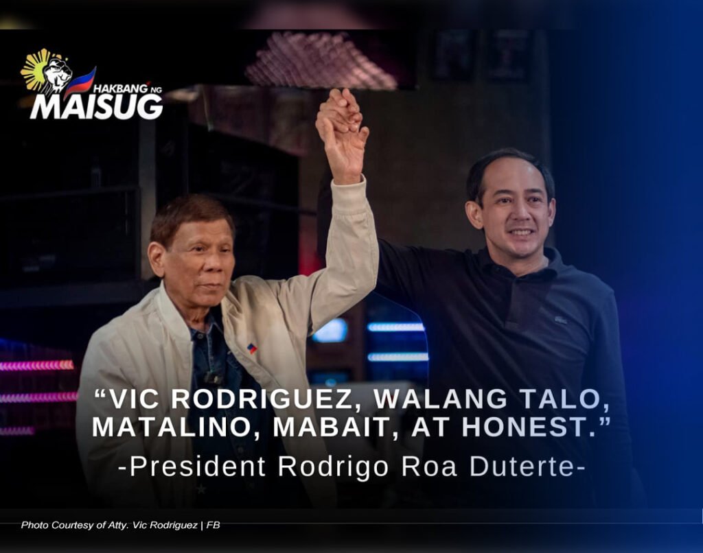 (SAKSI NGAYON NEWS TEAM) NAGPAKITA ng kanyang buong suporta si dating pangulong Rodrigo Duterte sa kandidatura ni Atty. Vic Rodriguez sa Senado ngayong May 2025 midterm elections. Sa isa sa mga aktibidad ng Hakbang ng Maisug, itinaas ng dating pangulo ang kamay ni Rodriguez, ang unang executive secretary ng Marcos administration. Ani Duterte si Rodriguez ay walang talo, matalino, mabait, at honest. Kamakalawa, nagdaos ng thanksgiving mass ang mga tagasuporta ni Rodriguez sa Quezon City bilang panimula sa kanyang kampanya. Ngayong araw naman ang proclamation rally ng Partido Demokratiko Pilipino…