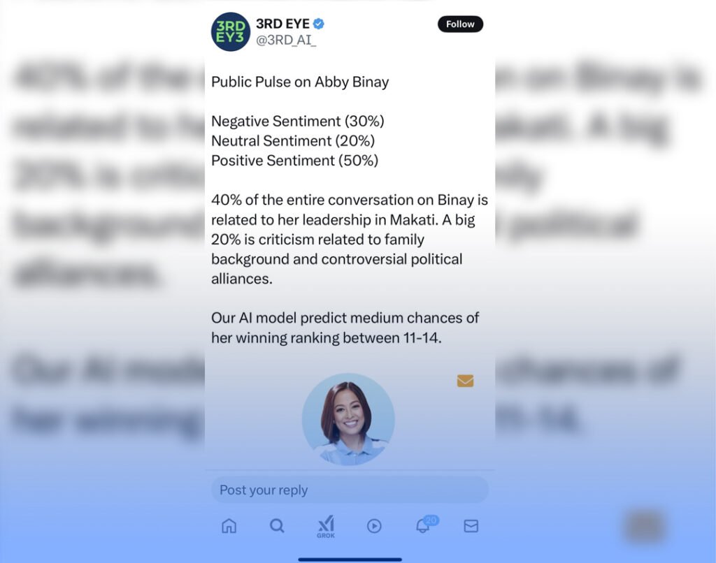 KUNG ang pag-aanalisa ng artificial intelligence ng 3RDEY3 (@3RD_AI_) ang pagbabasehan, may malaking porsyento na hindi makasasampa si Makati Mayor Abby Binay sa inaasam na Magic 12 sa Senado. Mababasa ang anilisasyon na ito sa X na pinost ng 3RD_AI_ kasama ng ilang mga kandidato ngayong midterm elections. Naitala ang tiyansa ni Abby Binay sa ika-11 hanggang ika-14 puwesto sa Magic 12 kaya pwede siyang malaglag sa ika-13 hanggang ika-14 puwesto sakaling lumakas ang kalaban nito. “Our AI model predicts medium chances of her winning ranking between 11-14,” giit ng…