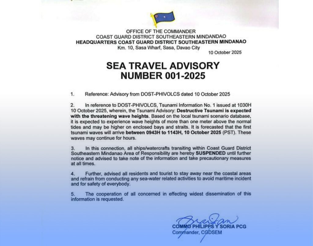NAKAALERTO na ang ilang distrito sa Southeastern Mindanao, Northeastern Mindanao at Eastern Visayas kasunod ng inilabas na tsunami warning. Ito ay makaraan ang nangyaring magnitude 7.4 na lindol na tumama sa Manay, Davao Oriental. Puspusan na ang isinasagawang coastal at sea monitoring ang mga tauhan ng PCG at nagbigay ng mga paalala sa publiko. Isinaaktibo na rin ang lahat ng Deployable Response Groups. Itinigil na rin pansamantala ang lahat ng water activities sa Siargao bilang bahagi ng precautionary measures. (JOCELYN DOMENDEN) 96