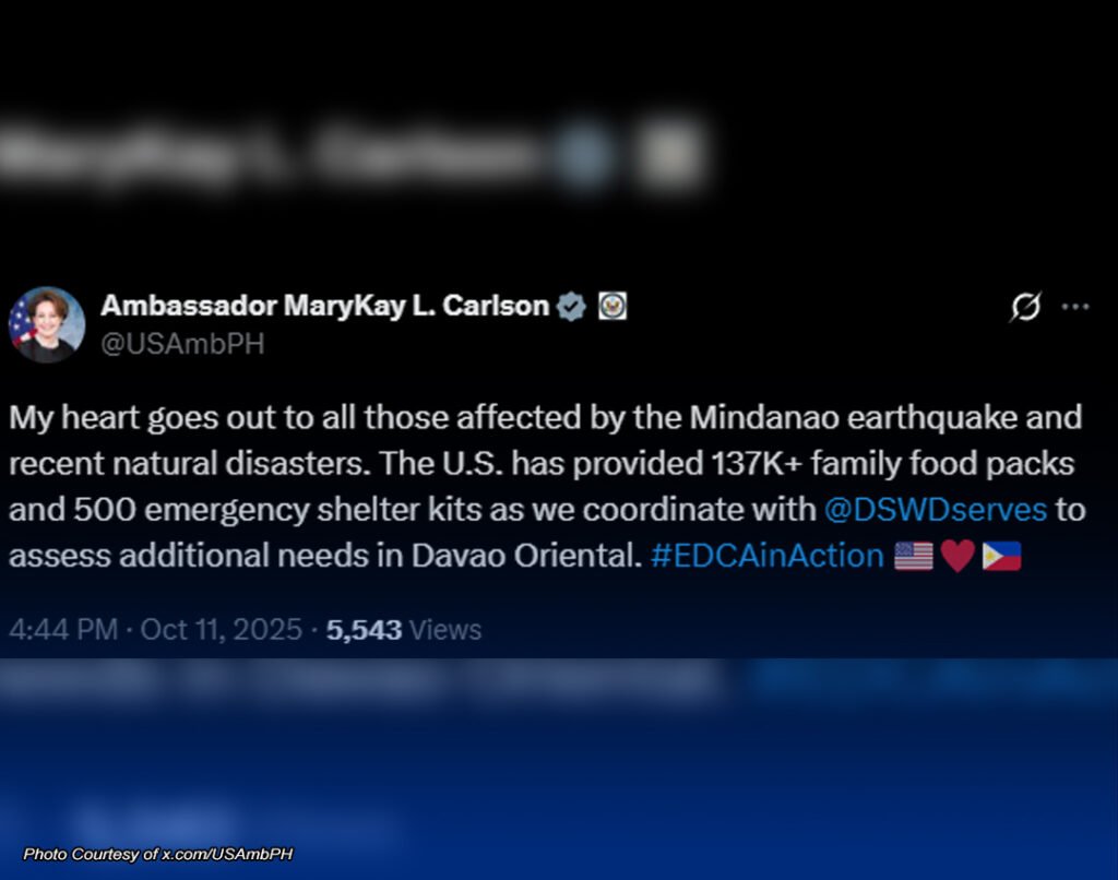 NASA 137,000 food packs at limang daang emergency shelter kits ang ipinadala ng United States para sa mga biktima ng magnitude 7.4 na lindol na tumama sa Davao Oriental, ayon kay US Ambassador MaryKay Carlson. Sa kanyang social media post sa X, inihayag ni Amb. Carlson na ang tulong ay bahagi ng “#EDCAinAction” sa ilalim ng Enhanced Defense Cooperation Agreement at isinasagawa kasama ng Department of Social Welfare and Development (DSWD). “My heart goes out to all those affected by the Mindanao earthquake and recent natural disasters,” ayon sa US envoy. Bukod…