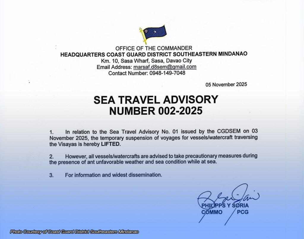 INALIS na ng Philippine Coast Guard (PCG) Davao Region ang suspensyon ng biyahe ng mga barko sa Visayas dahil sa bumubuting lagay ng panahon. Pinayagan na rin ng PCG station sa Surigao del Norte ang mga sasakyang-pandagat na maglayag mula sa probinsya ng Cebu. Sinabi ni Surigao del Norte PCG station commander, Ensign Roy Christopher Orillaneda, ang tropical cyclone warning signal ay wala na sa Cebu. Nangangahulugang maaari nang tumuloy sa kanilang destinasyon ang stranded na mga pasahero sa daungan sa Surigao City at Lipata. Inalis na rin ng PCG…