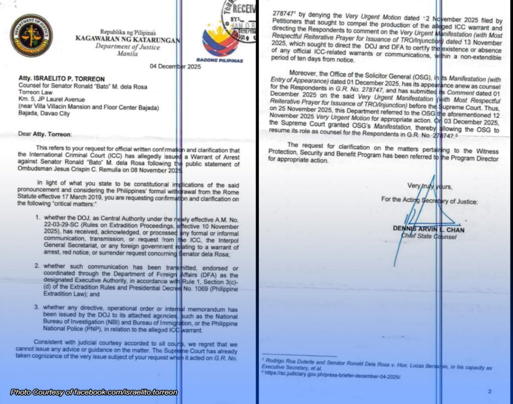 TINANGGIHAN ng Department of Justice (DOJ) ang hiling ng kampo ni Senador Ronald “Bato” Dela Rosa na magbigay ng impormasyon kaugnay ng sinasabing warrant of arrest na inilabas ng International Criminal Court (ICC) laban sa kanya. Sa isang online post, isinapubliko ng abogado ni Dela Rosa na si Atty. Israelito Torreon ang liham ng DOJ, na aniya’y inilabas upang malaman ng publiko ang opisyal na posisyon ng ahensya hinggil sa isyu. Ayon kay Chief State Counsel Dennis Arvin Chan, hindi maaaring magbigay ang DOJ ng anomang payo, gabay, o impormasyon…