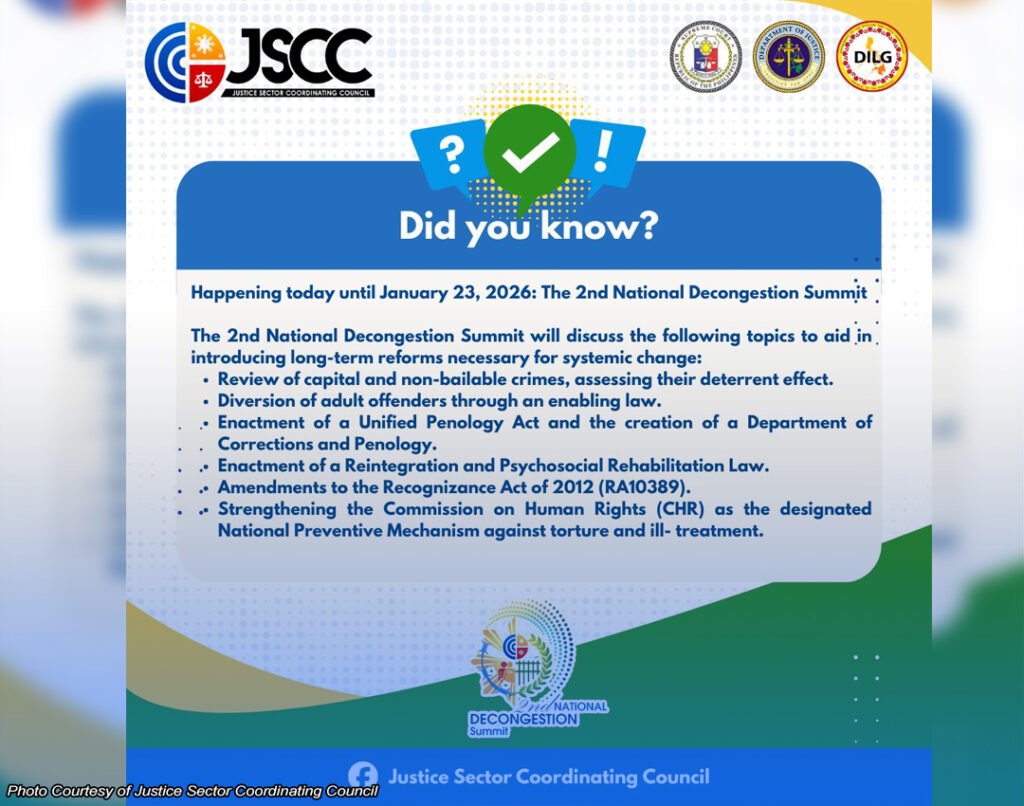 UMARANGKADA na sa Metro Manila ang ikalawang National Decongestion Summit sa pangunguna ng Justice Sector Coordinating Council o JSCC, na binubuo ng Korte Suprema, Department of Justice at Department of the Interior and Local Government (DILG) kahapon. Layon ng tatlong araw na aktibidad na gaganapin sa Manila Hotel mula January 21-23, para paigtingin ang mga hakbang para sa pagpapaluwag ng mga piitan sa bansa. Kabilang sa mga pangunahing tatalakayin sa summit ang pagsasama o unification ng Bureau of Corrections at Bureau of Jail Management and Penology sa isang integrated correctional…
