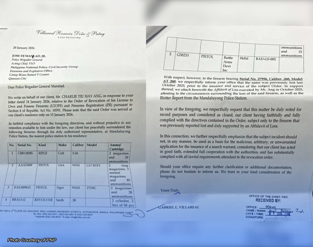 ISINUKO na ng kampo ng negosyanteng si Charlie “Atong” Ang ang kanyang mga baril sa Firearms and Explosives Office (FEO) ng Philippine National Police (PNP) matapos bawiin ang mga lisensya nito. Sa liham na may petsang Enero 20, 2026 na ipinadala kay PBGEN Jose DJ Manalad Jr., acting FEO chief, sinabi ng abogado ni Ang na si Atty. Gabriel Villareal na nai-turnover na ang mga armas ng kanyang kliyente sa Mandaluyong Police Station. Ang mga kopya ng naturang liham ay nakuha ng mga mamamahayag na sumusubaybay sa kaso. “Bilang tapat…