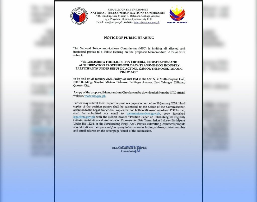 MAGSASAGAWA ng public hearing ngayong araw (Biyernes, Enero 23) ang National Telecommunications Commission (NTC) tungkol sa panukalang memorandum circular na siyang magtatakda ng mga pamantayan, kwalipikasyon, pagpaparehistro, at proseso ng awtorisasyon para sa Data Transmission Industry Participants, alinsunod na rin sa Republic Act No. 12234 o ang Konektadong Pinoy Act. Inaasahang dadalo sa pagdinig ang mga pinuno at kinatawan ng Department of Information and Communications Technology (DICT), Department of Economy, Planning, and Development, Anti-Red Tape Authority, Department of Public Works and Highways, Department of the Interior and Local Government, Department…