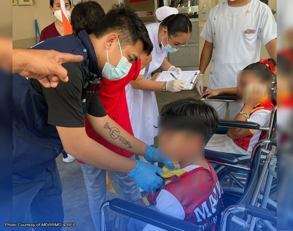 QUEZON – Siyam na miyembro ng Barangay Malabanban Norte Elementary School lyre band, kabilang ang limang menor de edad, ang nasugatan nang tamaan ng mga paputok habang nakikilahok sa prusisyon para sa Mahal na Birhen ng Caysasay noong Linggo ng hapon sa bayan ng Candelaria. Agad silang inilikas at dinala sa ospital. Agad din silang na-discharge na matapos malapatan ng lunas. (NILOU DEL CARMEN) 23