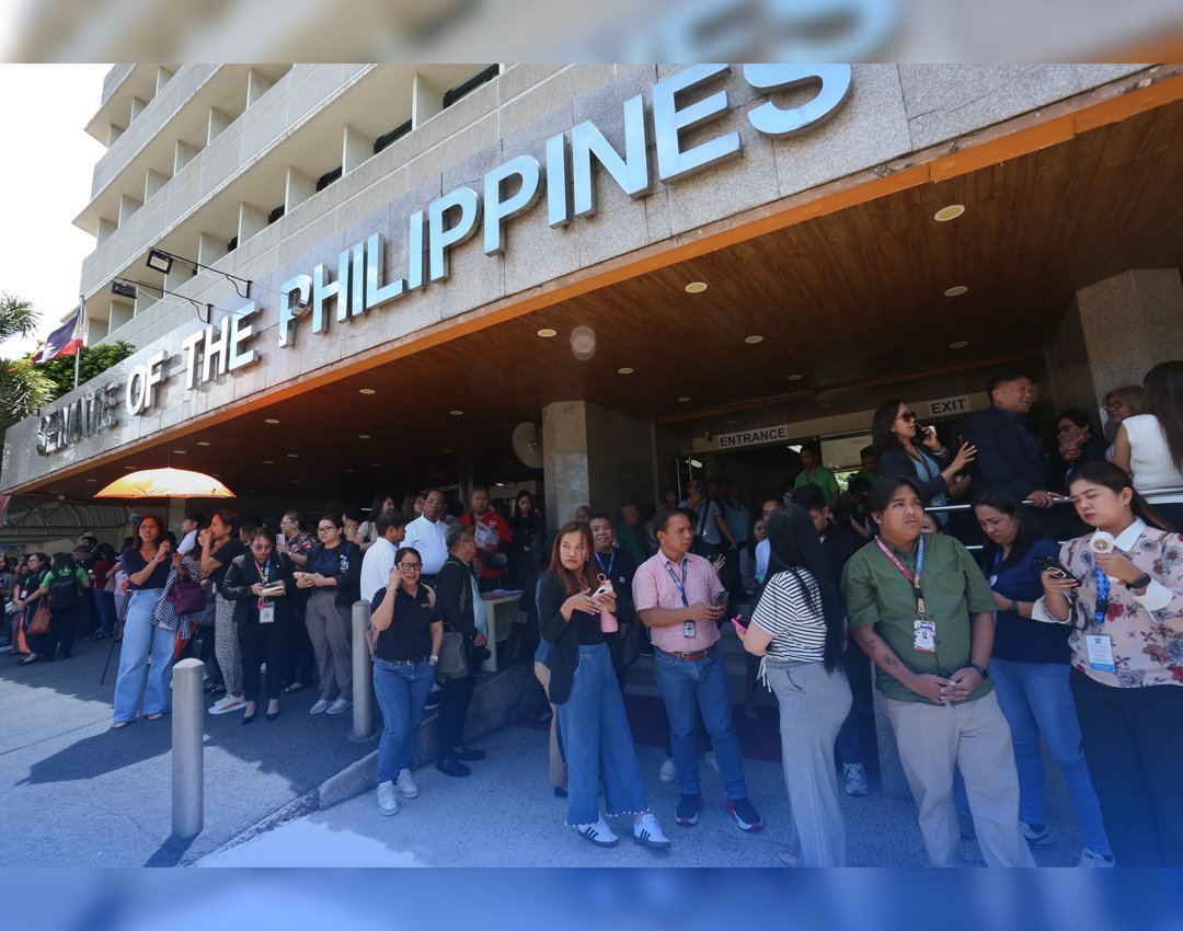 LUMABAS sa kani-kanilang opisina ang mga empleyado ng Senado sa Pasay City matapos maramdaman ang 5.1 lindol na yumanig sa lalawigan ng Quezon kahapon. (DANNY BACOLOD)