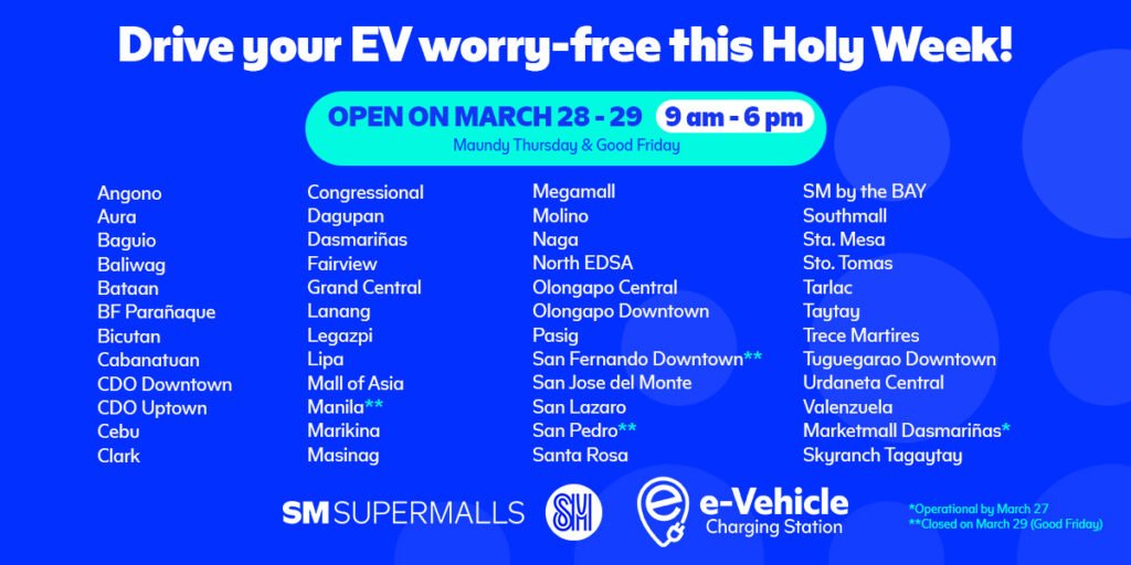 SM Supermalls provides FREE Electric Vehicle Charging Stations across 50 SM malls nationwide, majority of which will be operational throughout the Holy Week.