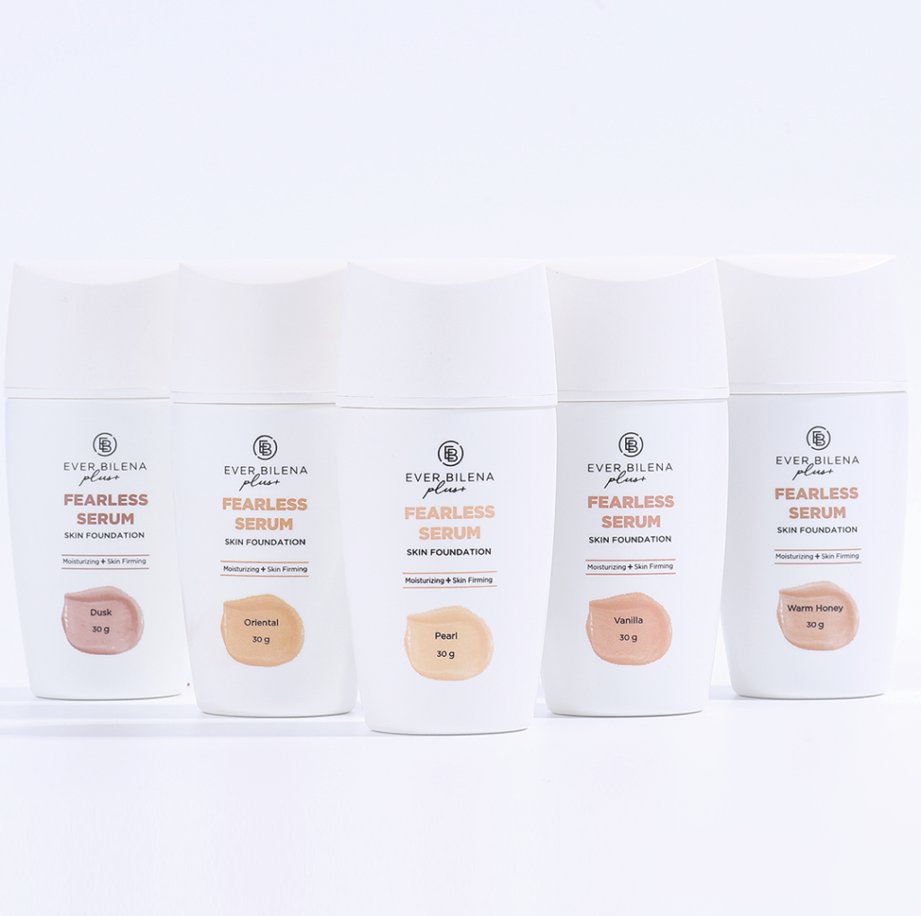 The EB Plus Fearless Serum Liquid Foundation comes in five wearable shades: Dusk, Oriental, Pearl, Vanilla, and Warm Honey.