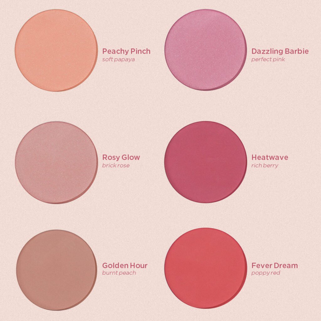 The line includes matte shades like Heatwave, which is a rich berry; Fever Dream, a poppy red; and Golden Hour, a burnt peach. As well as wearable subtly shimmery shades in Rosy Glow, a brick rose; Dazzling Barbie, a perfect pink; and Peachy Pinch, a soft papaya peach.