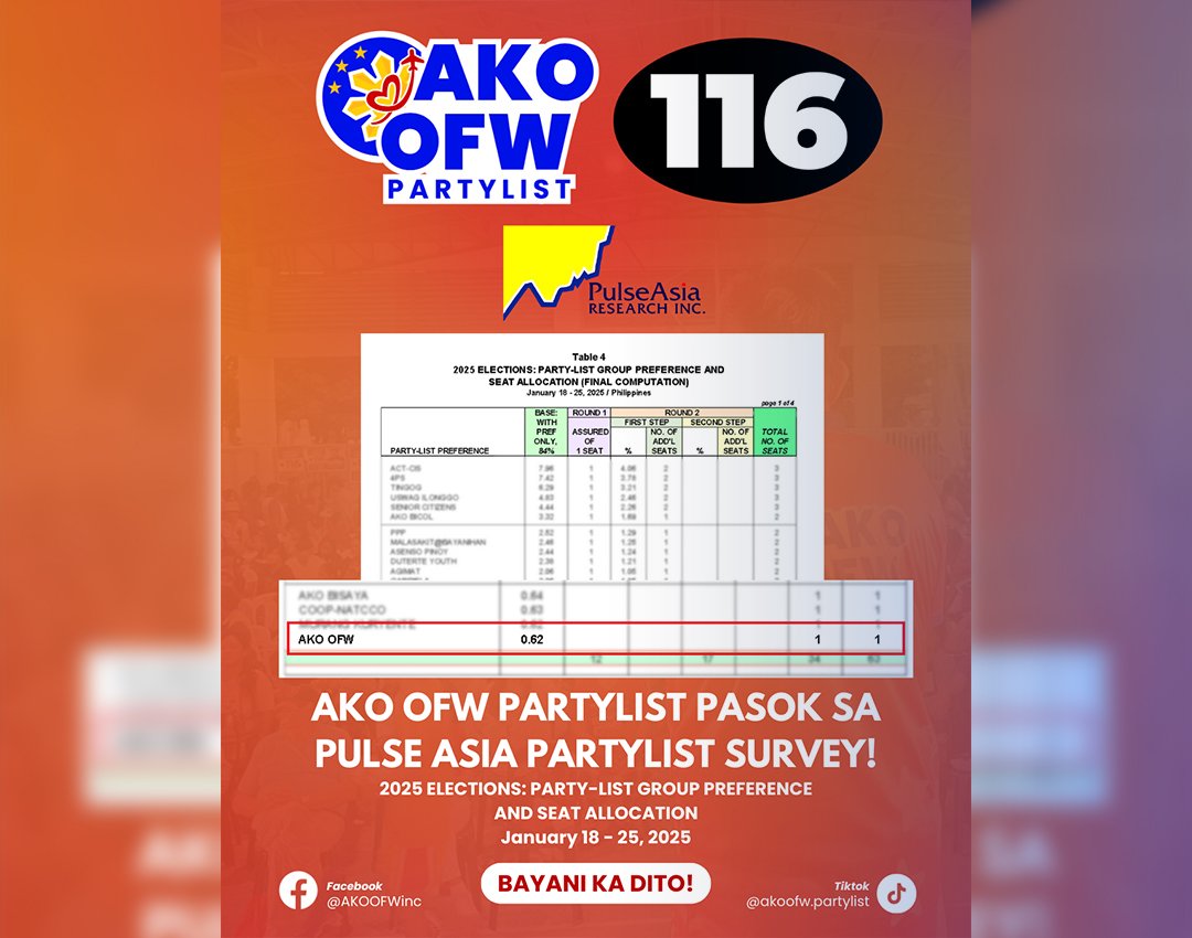 PASOK ang AKO—OFW party-list sa mga mananalong party-list group kung ang eleksyon ay gaganapin ngayon batay sa isinagawang survey ng Pulse Asia para sa 2025 midterm election.