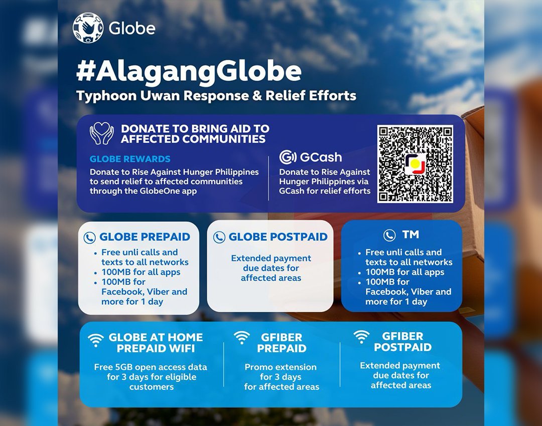 Globe continues to provide support for customers in typhoon-affected areas by offering free call, text, and data services for Globe Prepaid and TM subscribers, extending payment deadlines for Globe Postpaid and GFiber accounts, and providing free data allocations for Globe At Home Prepaid WiFi users. Customers can also use Globe Rewards and GCash to support on-ground relief partners delivering essential aid to families across Luzon.