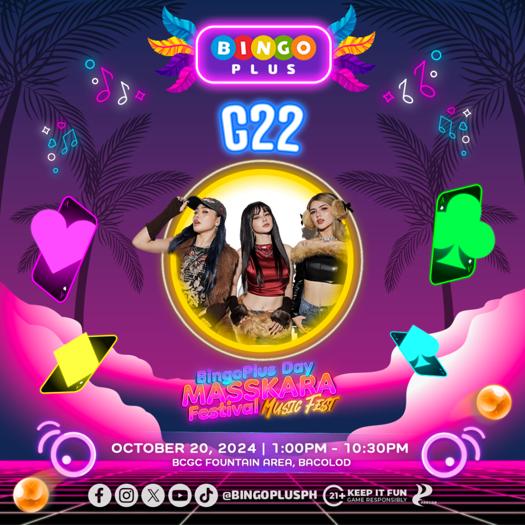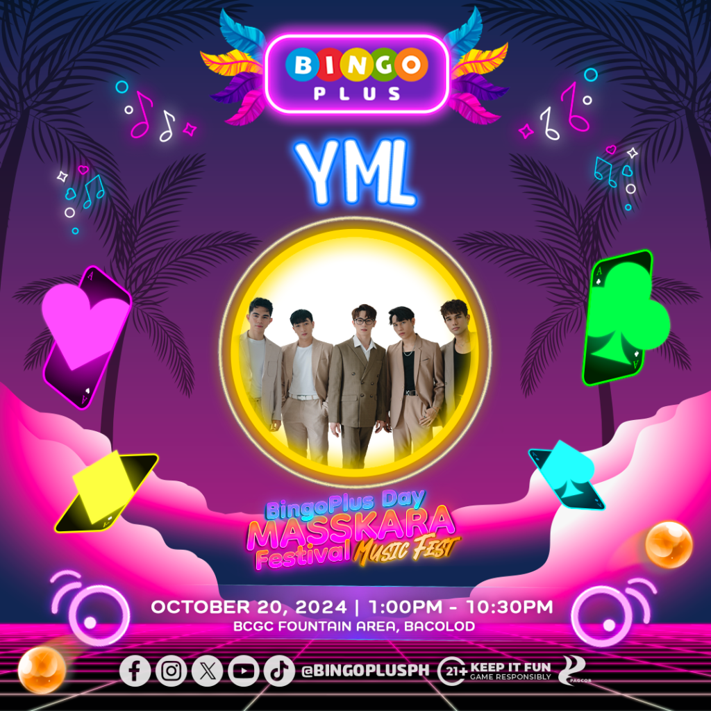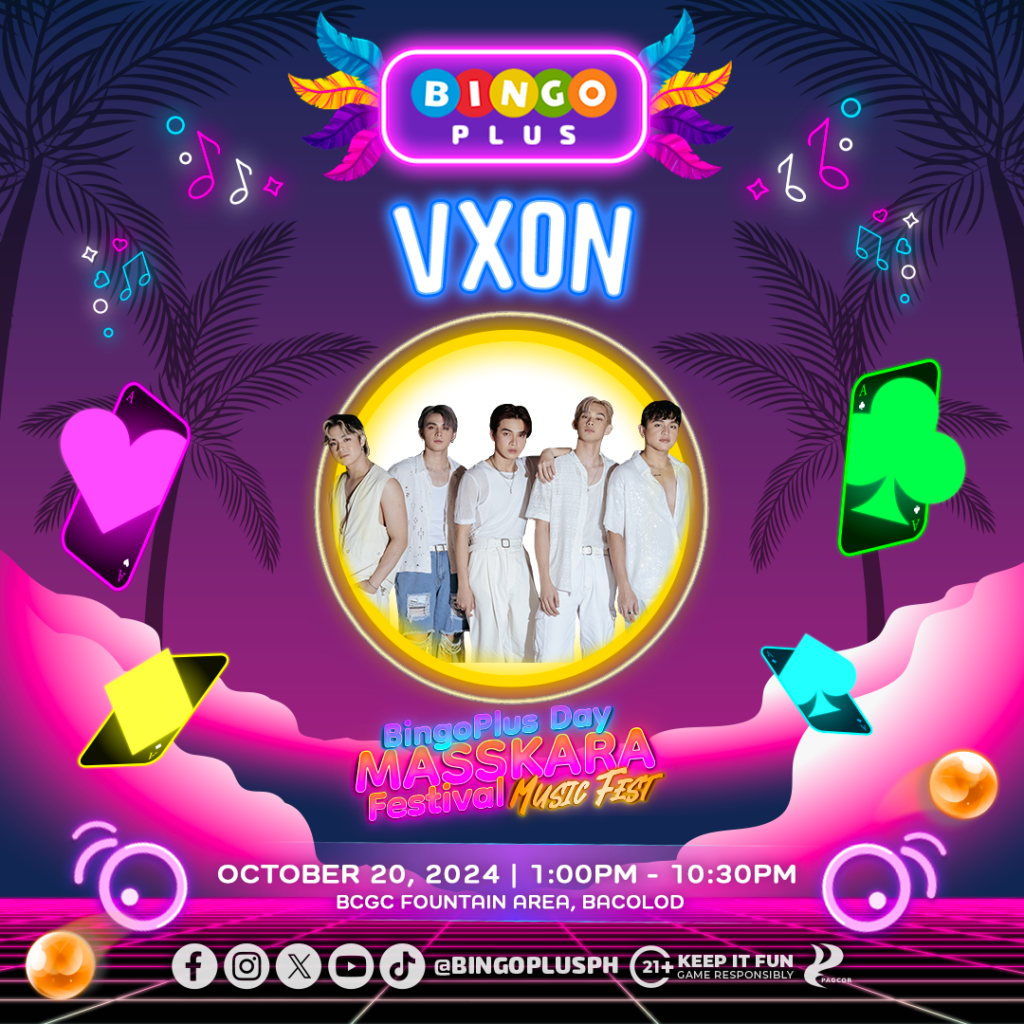 Maki-rock and dance sa BingoPlus Day Masskara Festival Music Fest on October 20 sa Bacolod City Government Center. Abangan ang mga paborito mong performers tulad ng YML, G22, at VXON from 1:00 PM to 06:00 PM sa BingoPlus stage pre-show.