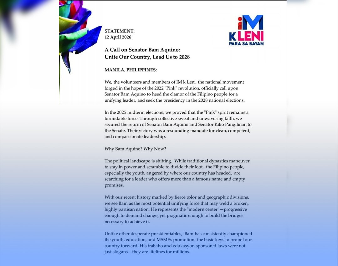 PORMAL na nanawagan ang mga lider ng IM k Leni movement kay Senador Bam Aquino na tumakbo bilang pangulo sa halalan ng 2028, sa gitna ng panawagan para sa pagkakaisa ng bansa at pagtalikod sa nakasanayang pulitika ng patronage at katiwalian.