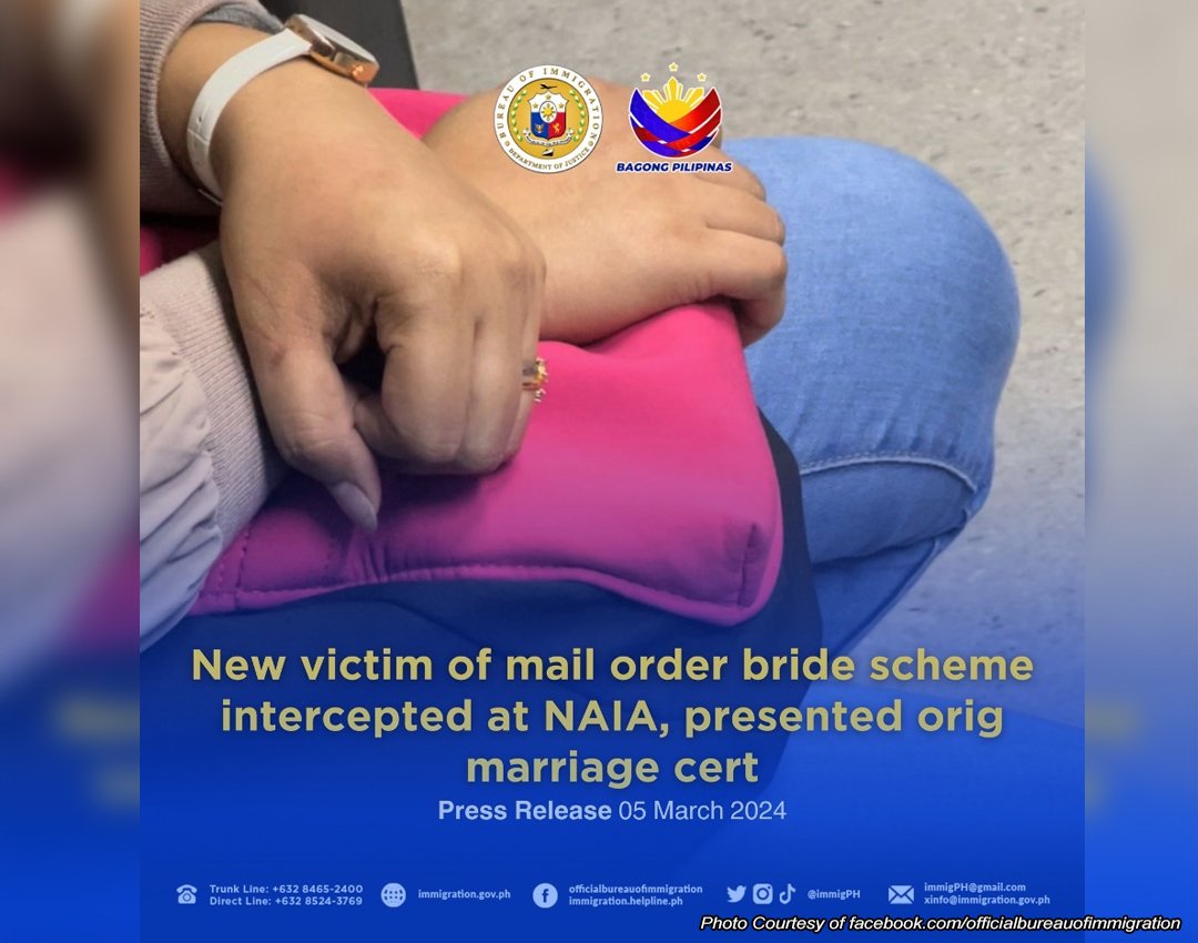 NASABAT ng mga tauhan ng Bureau of Immigration (BI) ang isang biktima ng mail order bride scheme, na patungo sa China at nagpakita pa ng genuine na dokumento.
