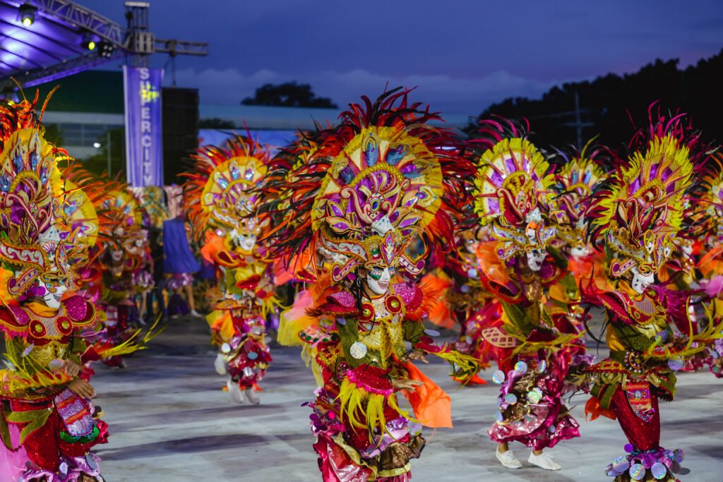 MassKara dancers in colorful masks gracing the crowd during the MassKara Arena Competition.