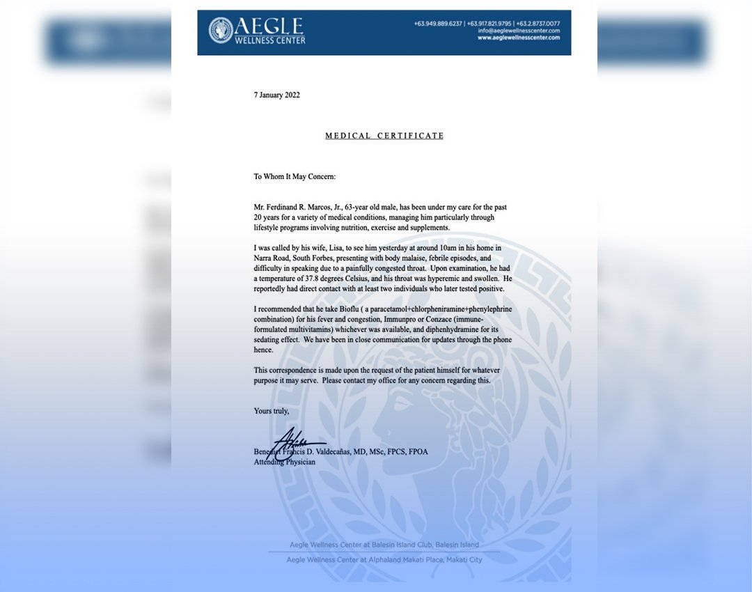 Marcos’ attending physician, Benedict Francis Valdecanas, issued a medical certificate saying that the former senator has difficulty in speaking due to a painfully congested throat and a fever.