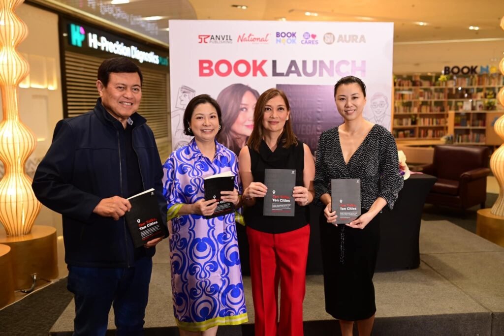 Advertising veteran Merlee Jayme (second from right) launches her book “Ten Talks, Ten Cities” with (L-R): Businessman and former politician Manny Villar, National Bookstore’s Xandra Ramos-Padilla, and Book Nook founder Shereen Sy at the Book Nook in SM Aura.