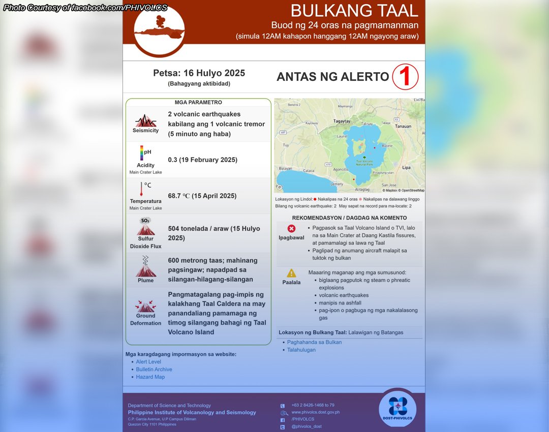 NABATID mula sa Philippine Institute of Volcanology and Seismology (Phivolcs) na ang Bulkang Taal sa lalawigan ng Batangas ay patuloy na nagpapakita ng aktibidad ng volcanic earthquake at pagyanig na naitala noong nakaraang araw at nitong Miyerkules.