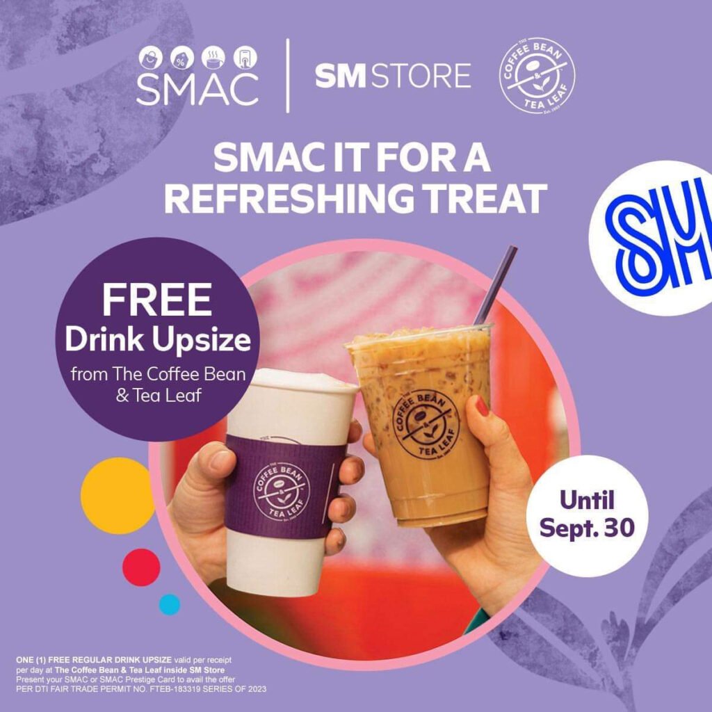 With any SM Store purchase, holders of the SM Advantage Card (SMAC), BDO Rewards Card, MOM Card, and Love Your Body Card receive a free upsize on drinks at Coffee Bean & Tea Leaf branches located inside select SM Stores until September 30!