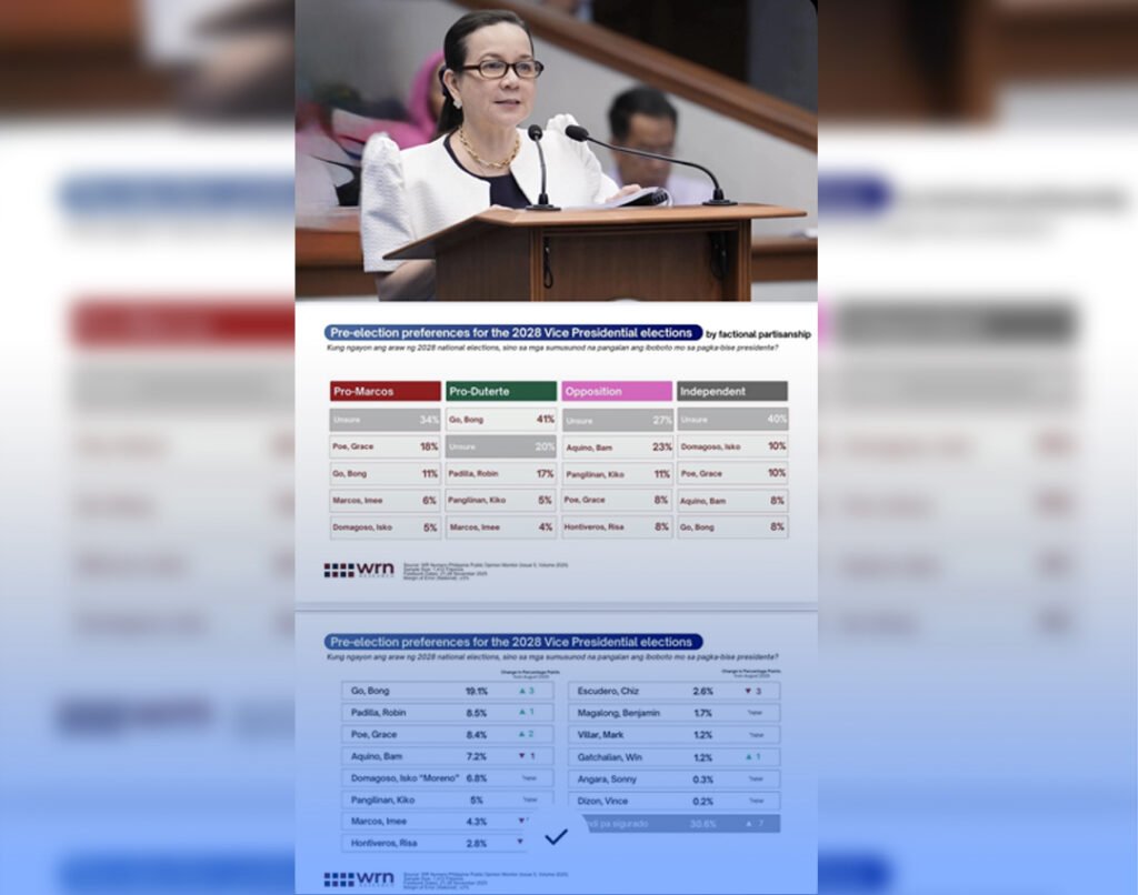 MAYNILA — Lumalakas ang posisyon ni dating Senador Grace Poe sa laban para sa pagka-bise presidente sa 2028, batay sa pinakabagong survey ng WR Numero Research na inilabas kahapon ng umaga. Sa kabila ng dikit na labanan sa pangkalahatang ranggo, si Poe ang nangunguna sa hanay ng independent voters, na nakapagtala ng 10%, kapantay ni Manila Mayor Isko Moreno, at mas mataas kumpara kina Sen. Bam Aquino at Sen. Bong Go na may tig-8%. Sa overall tally: • Bong Go — 19.1% (+3 mula Agosto 2025) • Robin Padilla —…