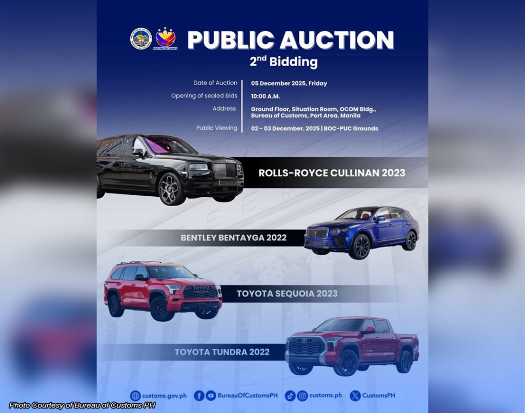 INIHAYAG ng Bureau of Custom na magkakaroon ng ikalawang round ng public auction para sa mga luxury vehicle na nasamsam mula sa mag-asawang contractor na sina Pacifico at Cezarah Discaya, na inaakusahang sangkot sa multi billion flood control scandal. Sa inilabas na anunsyo ng BOC, itinakda ang 2nd round ng public auction sa Disyembre 5, sa pamamagitan ng sealed bidding para sa high-end vehicles simula alas-10 ng umaga sa BOC main office sa Port Area, Manila. Isasailalim sa auction ang tig-iisang unit ng 2022 Toyota Tundra, 2023 Toyota Sequoia, 2023…