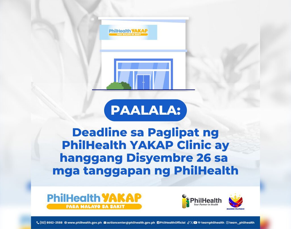Pinaaalalahanan ng Philippine Health Insurance Corporation (PhilHealth) ang lahat ng miyembro na nais lumipat ng kanilang PhilHealth YAKAP Clinic ay maaaring magtungo sa mga PhilHealth Local Health Insurance Office hanggang sa Biyernes, ika-26 ng Disyembre. Ito ay upang matiyak na tuloy tuloy ang pagtanggap ng mga benepisyo sa ilalim ng PhilHealth YAKAP Program. Para lumipat sa ibang YAKAP Clinic, mayroon man o walang naganap na First Patient Encounter (FPE), kailangang pumunta ang miyembro o ang kanilang dependent sa pinakamalapit na LHIO upang magsumite ng nasagutang Primary Care Selection Form (PCSF).…