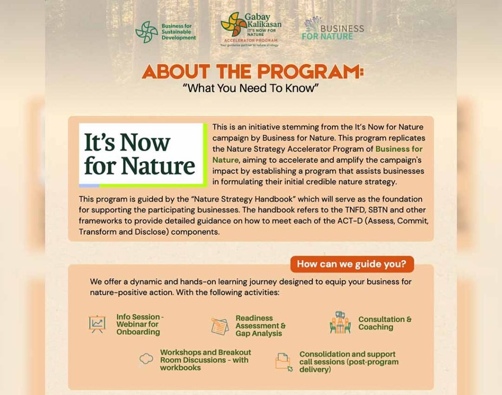 Business for Sustainable Development (BSD) has officially opened registration for its Gabay Kalikasan: It’s Now for Nature Accelerator Program for businesses – the first and only program of its kind in the Philippines. This initiative includes 10 sessions spread across nine months for participating companies to absorb nature principles and develop credible and actionable nature strategies that are aligned with global sustainability frameworks. Gabay Kalikasan is part of BSD’s efforts to strengthen the role of private sector and consolidate efforts that promote biodiversity and nature-positive outcomes. The program equips participating…