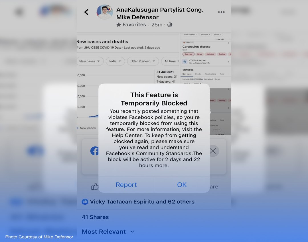 “Facebook just blocked me for giving my analysis on the Covid update report posted in the internet,” ani Defensor na ang tinutukoy ay ang pagkukumpara nito sa Utter Pradesh, India na gumagamit ng Ivermectin sa mga bansa tulad ng United States (US), United Kingdom (UK) at Israel sa COVID-19 infection at vaccination.