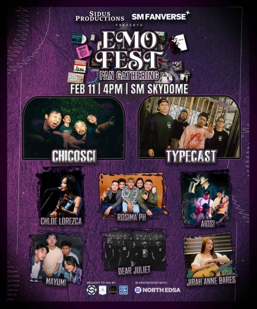 Live Performances from local Emo Bands: Sing your hearts out all night with the performances from two iconic pinoy Emo bands- Chicosci and Typecast. Front acts will include new-gen artists Chloe Lorezca, Rosima PH, AIOS, Mayumi, Dear Juliet, and Jirah Anne Bares.