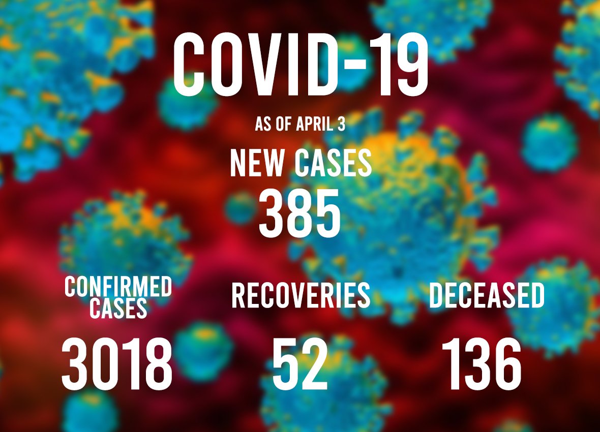 NAKAPAGTALA ng 385 na bagong kaso ng COVID-19 ang Department of Health kaya pumalo na sa 3,018 ang kabuuang bilang ng mga tinamaan ng sakit na ito.