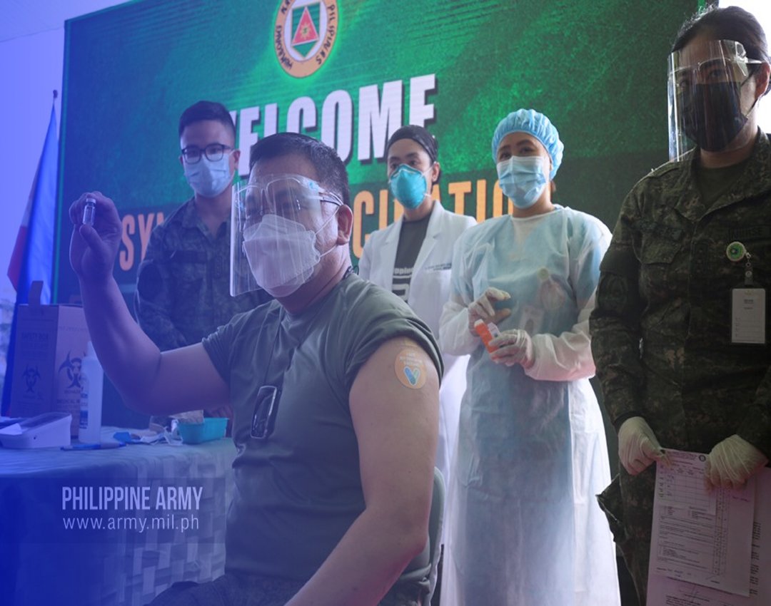 Unang sumalang si Lt. Gen. Jose C. Faustino, Commanding General Philippine Army (CGPA) sa ceremonial COVID-19 vaccination na ginanap sa Army headquarters, Fort Bonifacio, Taguig City. Mensahe ng heneral sa kasundaluhan, “Remember that being inoculated is our duty to the country and to the Filipino people whom we have sworn to serve and protect.” (JESSE KABEL)