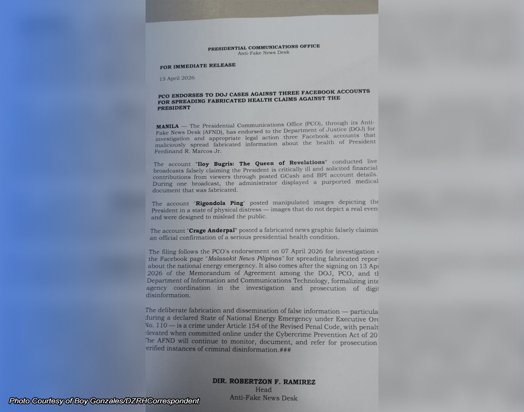 Ito’y matapos muling dumulog sa DOJ ang Presidential Communications Office (PCO) upang magsumite ng panibagong referral kaugnay sa kumalat na fake news.