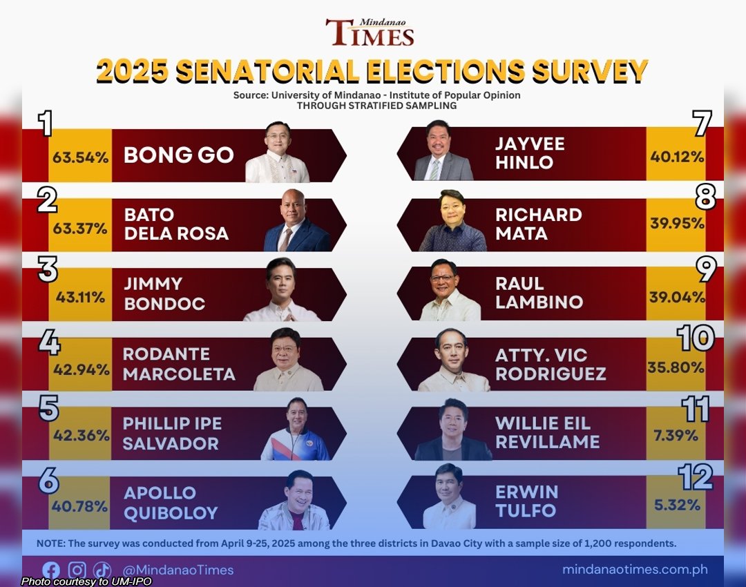 NANGUNA ang mga pambato ng Duterte Senate slate sa isinagawang survey ng University of Mindanao- Institute of Popular Opinion sa tatlong distrito ng Davao City.