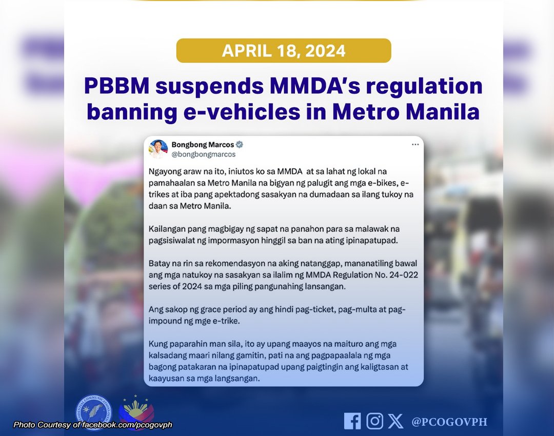 IPINAG-UTOS ni Pangulong Ferdinand Marcos Jr., sa Metropolitan Manila Development Authority (MMDA) at sa lahat ng lokal na pamahalaan sa Kalakhang Maynila na bigyan ng palugit ang e-bikes, e-trikes at iba pang apektadong sasakyan na dumadaan sa ilang tukoy na daan sa Metro Manila.
