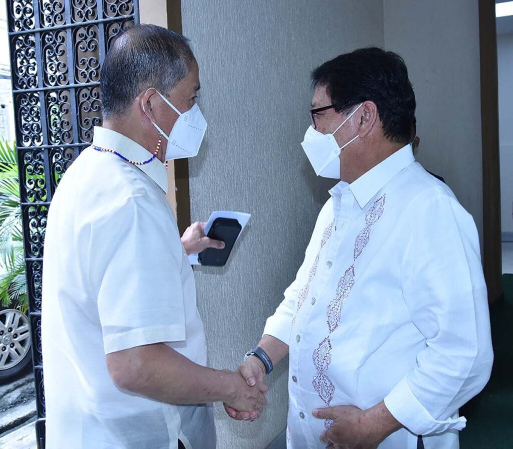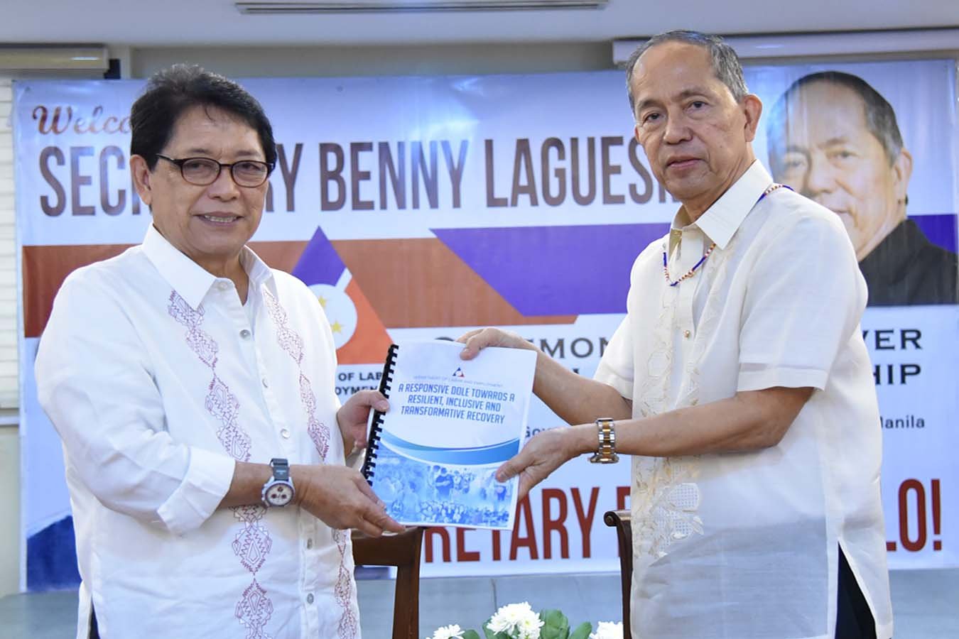 NEW DOLE SECRETARY. Newly-installed Labor and Employment Secretary Bienvenido E. Laguesma (right) receives the DOLE flag and other transition documents from outgoing Labor Secretary Silvestre H. Bello III (left) during the turnover ceremony on July 1 at the Labor Governance Learning Center (LGLC) in Intramuros Manila on July 1. Secretary Laguesma started his public service career at DOLE as a mediator-arbiter, administrator, executive director, undersecretary, and eventually Department Secretary during the Estrada administration. The new labor chief looks forward to making DOLE a more responsible and responsive institution that reaches out to needy workers, especially those in rural and far-urban areas (Photo by Jerome Sajise DOLE/IPS)