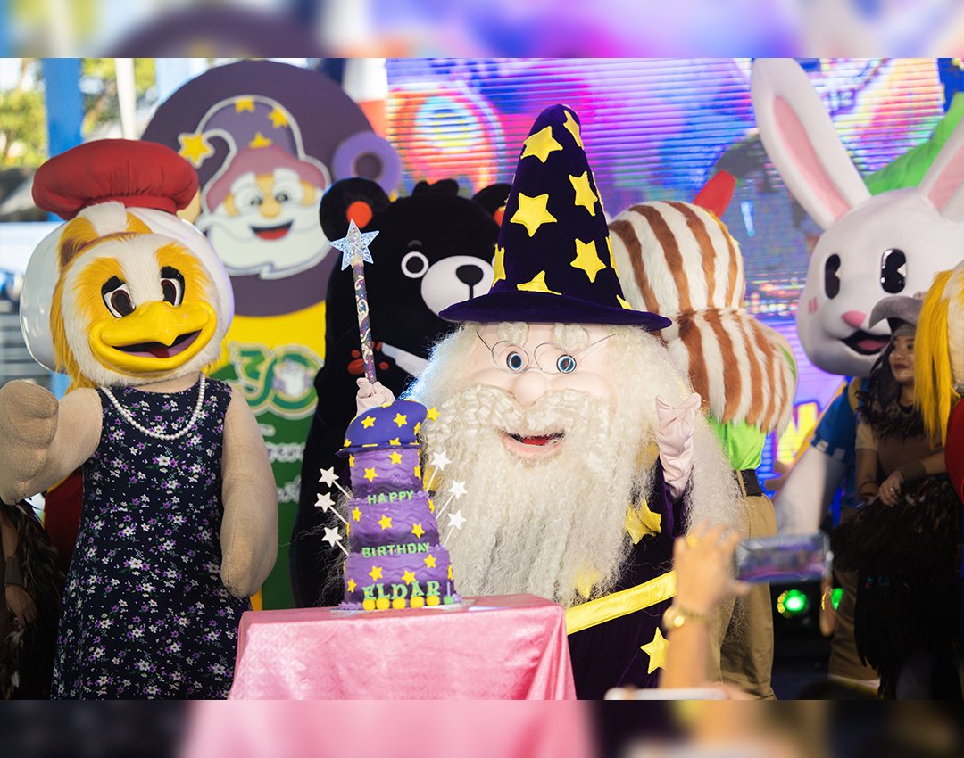 Afterwards, the whole magical kingdom, including the other EK characters and sponsor mascots, joined Eldar for the enchanting birthday greeting and candle blowing. As special thanks, the jolly wizard treated everyone to an unforgettable nighttime spectacle featuring his vibrant Birthday Parade and Fireworks.