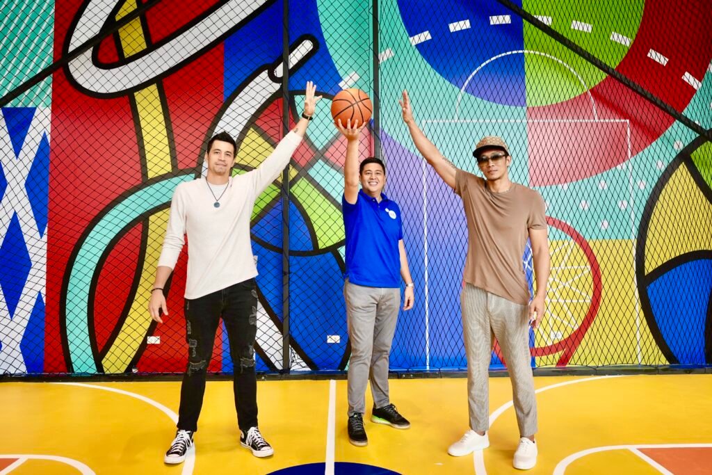 SM Lifestyle Sports & Leisure Centers Assistant Vice President for Operations Joseph Silva (center) performs the ceremonial first basketball jump ball with Philippine Basketball Association (PBA) stars Marc Pingris (left) and Jayjay Helterbrand (right) at the mini indoor basketball court.
