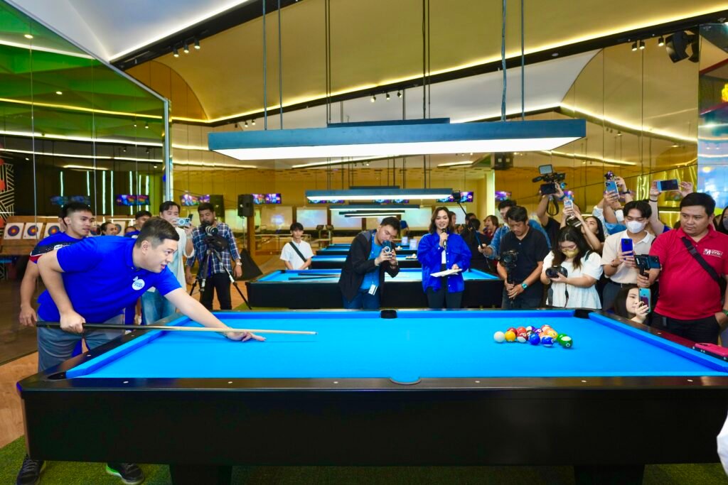 The ceremonial first billiards break shot is performed by SM Lifestyle Inc. Sports & Leisure Centers Assistant Vice President for Operations Joseph Silva (left) and SM Mall of Asia Mall Manager Rosaly Anne Salazar.