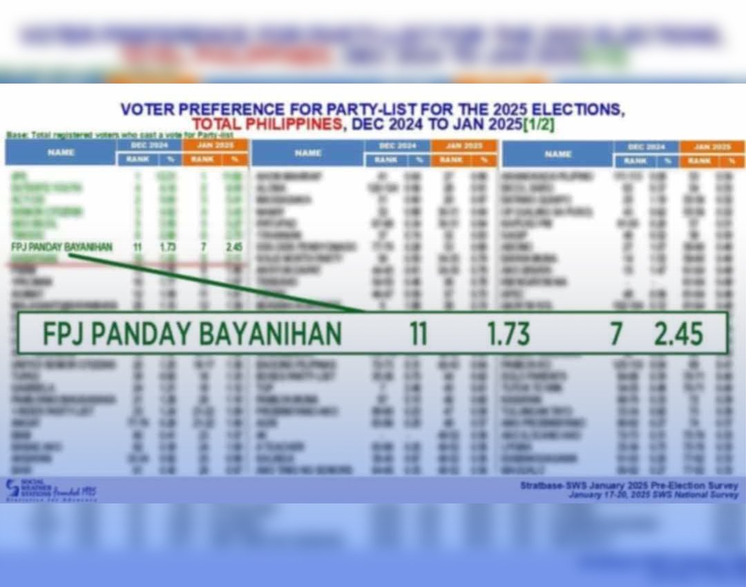 Ang FPJ Panday Bayanihan partylist, na pinamumunuan ng kanilang unang nominado na si Brian Poe, ay nakakuha ng 2.45 porsyento, na nagtitiyak ng kahit isang pwesto kung magaganap ngayon ang halalan.