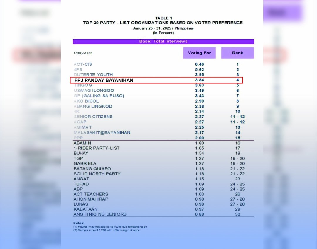 NAKUHA ng FPJ Panday Bayanihan partylist ang ikaapat na pwesto sa pinakabagong survey ng OCTA Research mula sa 156 partylists na magtutunggali sa 2025 midterm election.
