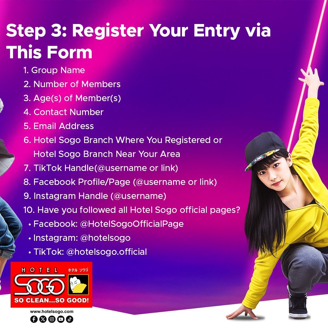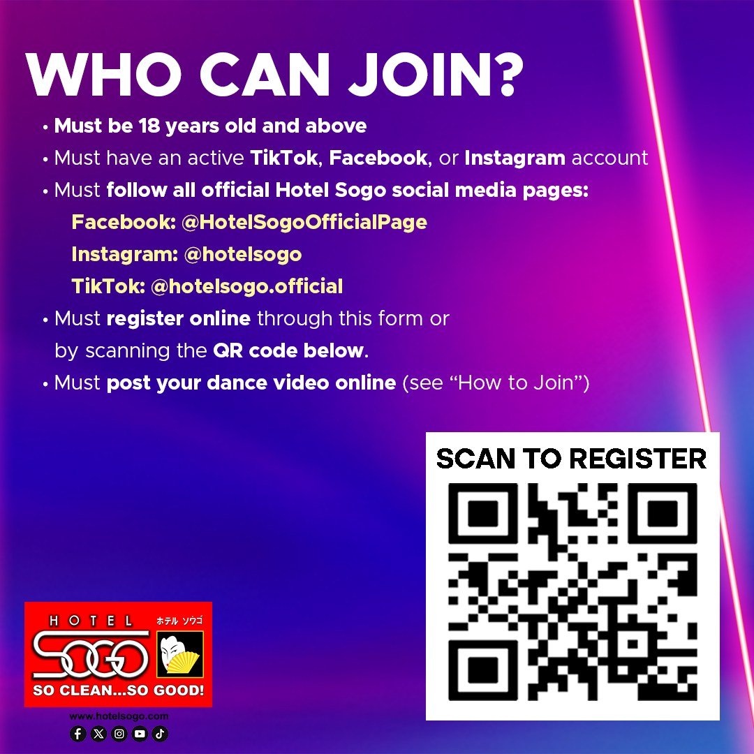 The video must tag @hotelsogo and be set to public. All members must follow Hotel Sogo’s official social media pages, and the group must register via an online form or QR code available at any Hotel Sogo branch nationwide.