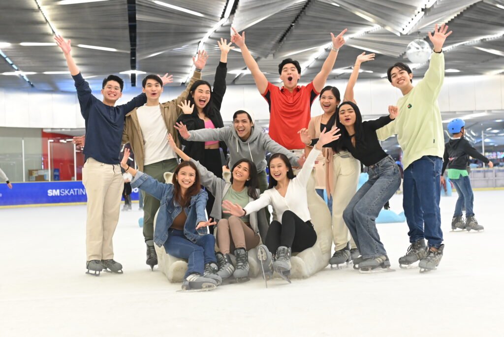A group of friends sharing a laugh as they glide across the ice at SM Megamall.
