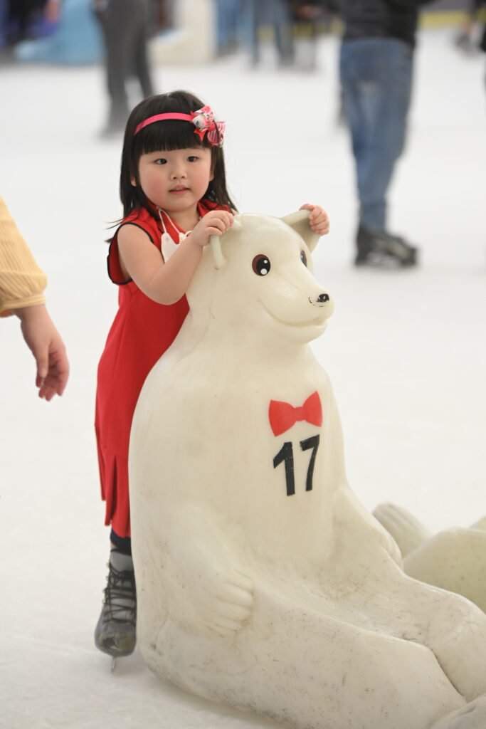 A beginner’s best friend: A young skater gets a helping hand from a polar bear skate-aid, designed to make learning safe and enjoyable for the little ones and adults.