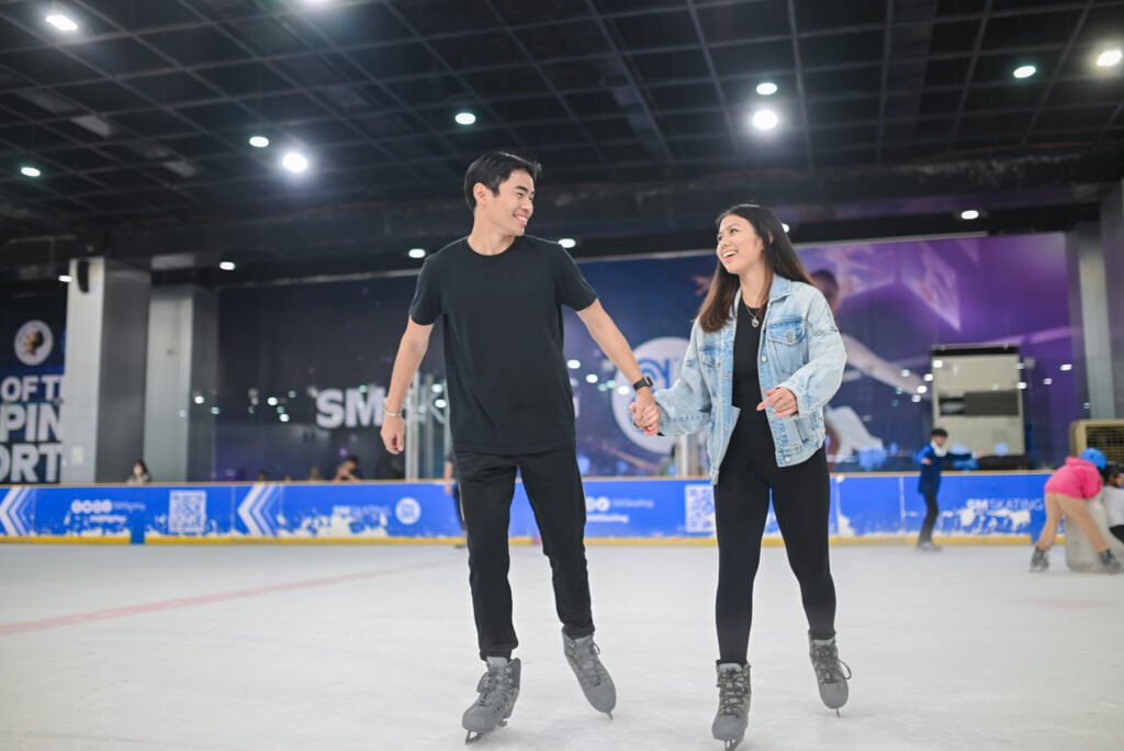 A couple enjoys a serene moment, hand in hand, amidst the lively atmosphere of the rink at SM Skating MOA.